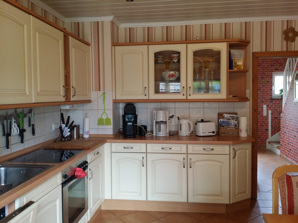 Die Küche ist voll ausgestattet – Kühlschrank, Herd mit Backofen und Abzugshaube, Spülmaschine. In den geräumigen Schränken finden Sie ausreichend Geschirr, Gläser, Besteck und alles, was Sie zum Kochen brauchen.